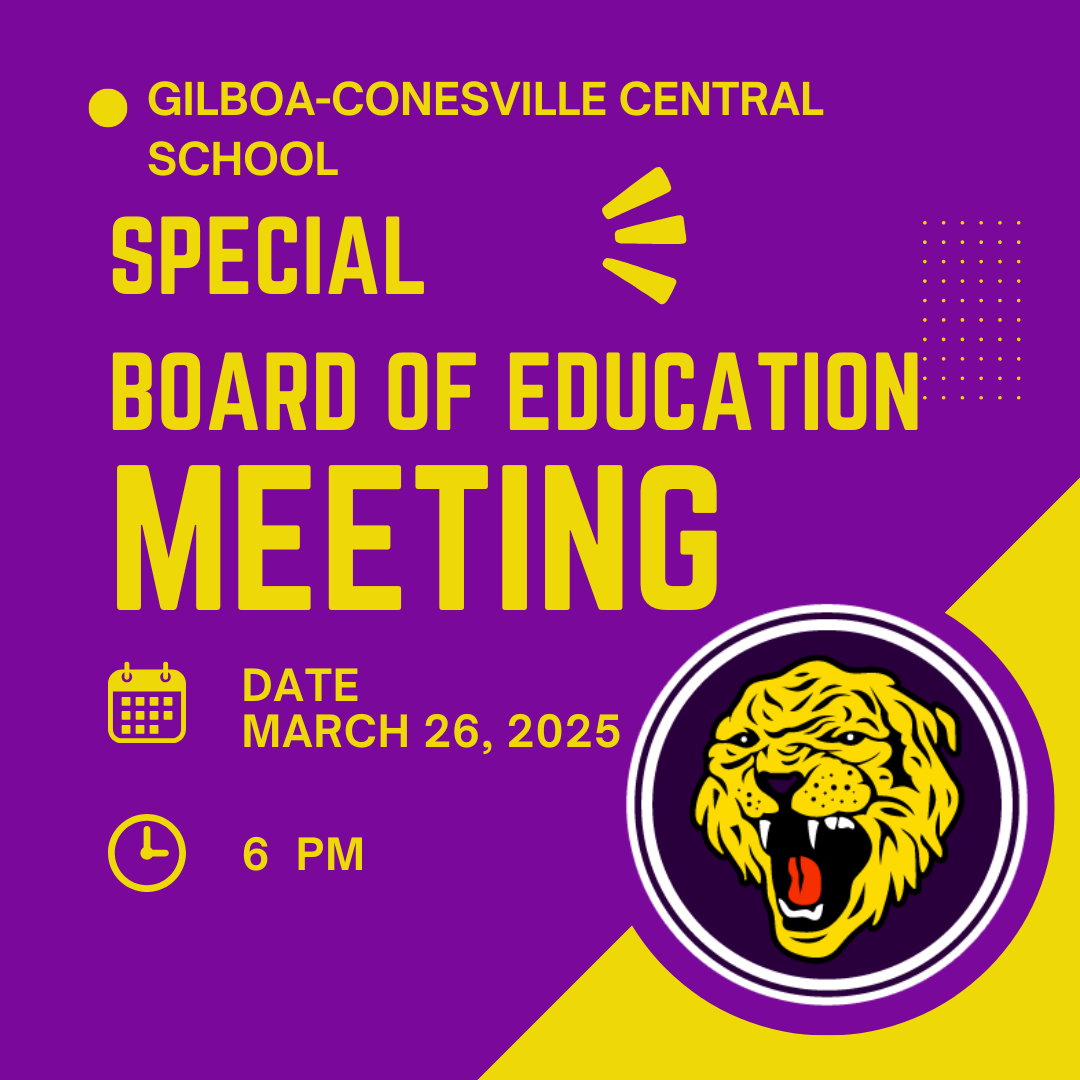 There will be a special Board of Education meeting on Wednesday, 3/26/25 starting at 6 pm in the auditorium. Thank you!